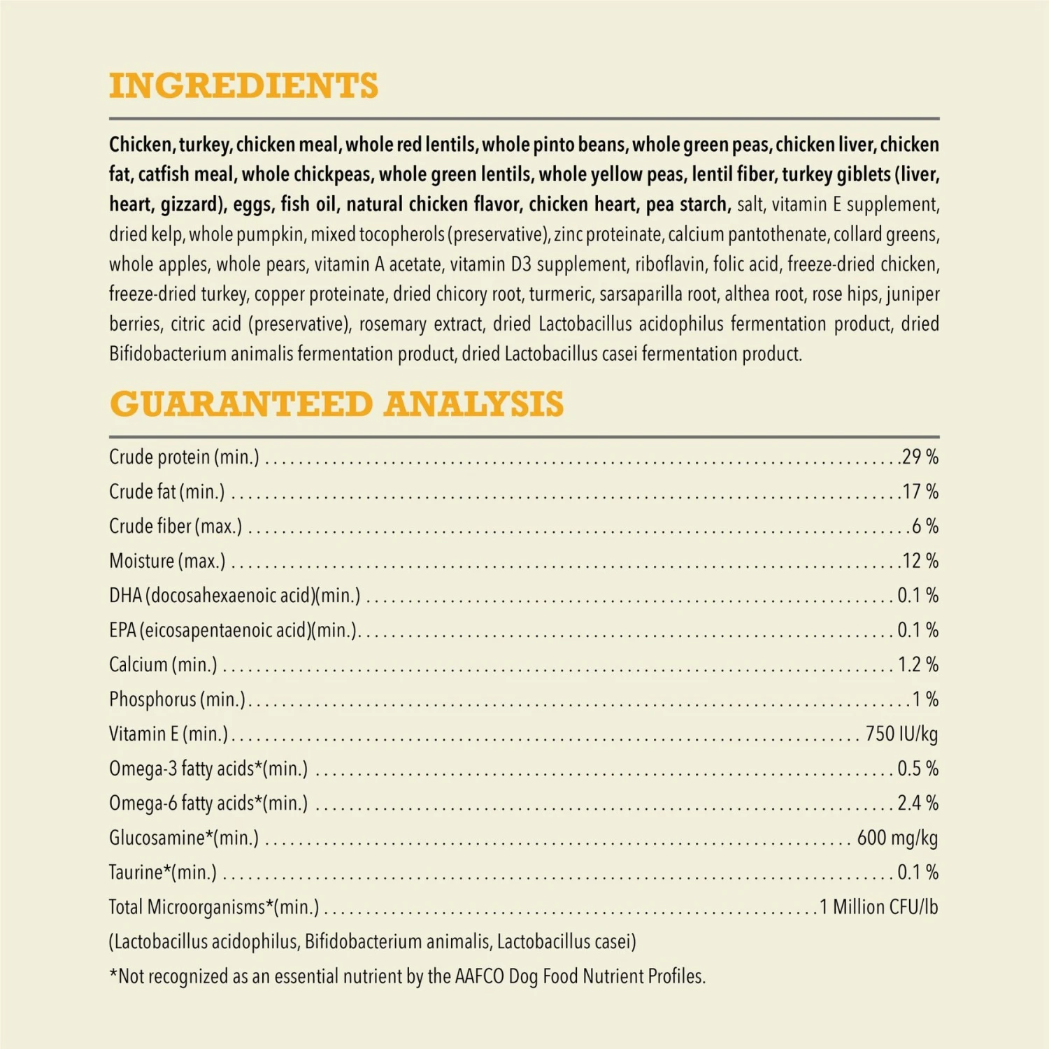- This grain-free kibble recipe starts with free-run chicken, turkey and cage-free eggs for a deliciously protein-rich meal.