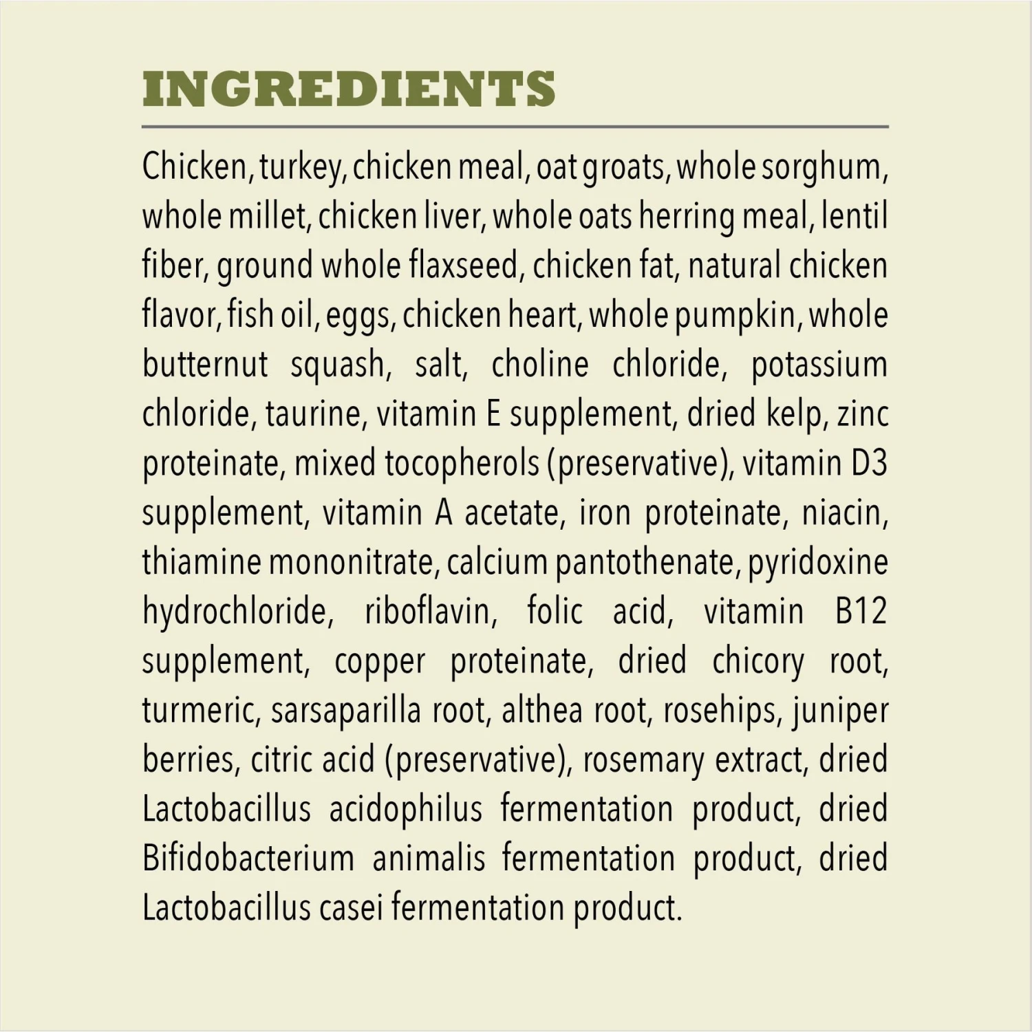 - High-protein food starts with free run chicken and free run turkey for 65% animal ingredients and 35% wholesome grains, fruits, and veggies.