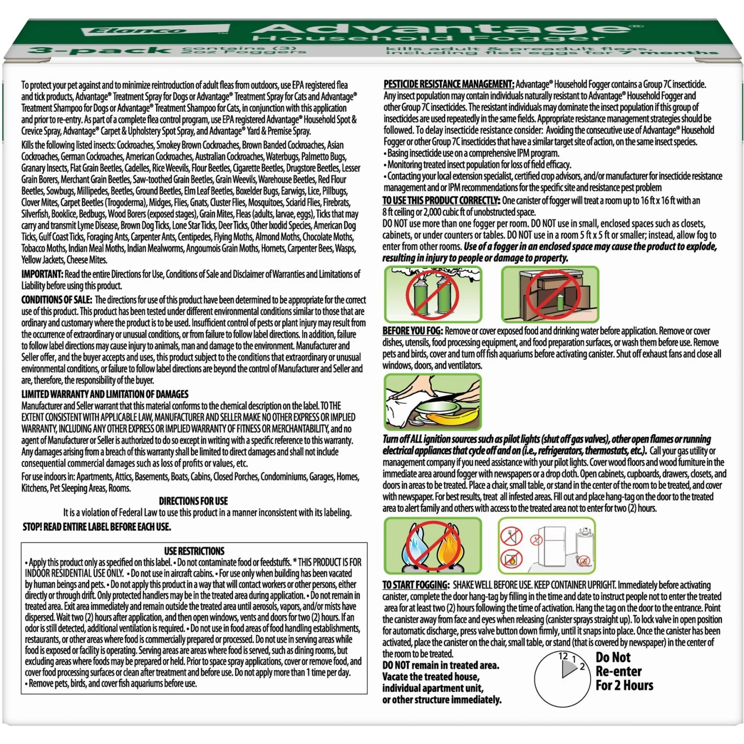 Do not use more than one fogger/room. Do not use in small, enclosed spaces such as closets, cabinets, or under counters or tables. Do not use in a room 5 ft. x 5 ft. or smaller, instead, allow fog to enter from other rooms. Use of a fogger in an enclosed space may cause the product to explode, resulting in injury to people or damage to property. BEFORE YOU FOG: remove or cover exposed food and drinking water before application. Remove or cover dishes, utensils, food processing equipment, and food preparation surfaces, or wash them before use. Remove pets and birds, cover and turn off fish aquariums before activating canister. Shut off all exhaust fans and close all windows, doors, and ventilators. Turn off all ignition sources such as pilot lights (shut off gas valves), other open flames or running electrical appliances that cycle off and on (i.e., refrigerators, thermostats, etc.). ALWAYS read the entire product label prior to use.