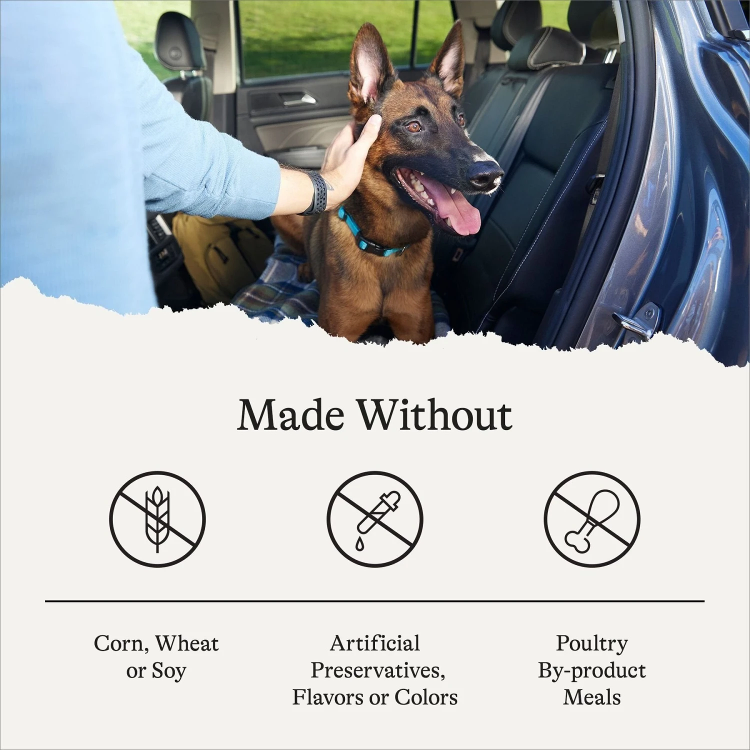 - No wheat, corn, soy, poultry by-product meals, artificial colors, artificial flavors or artificial preservatives.