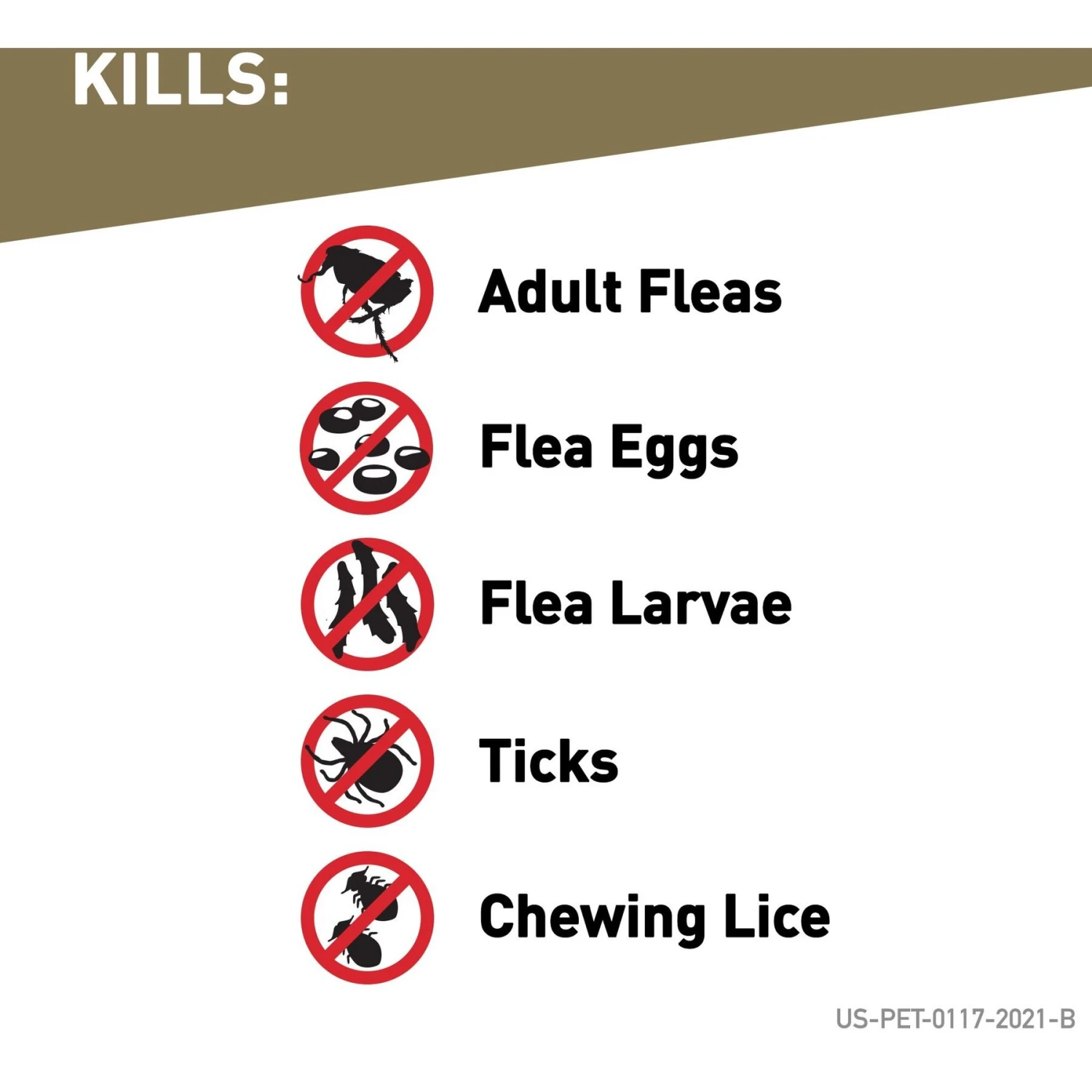 - Helps kill adult fleas, flea eggs, flea larvae, chewing lice, and ticks.