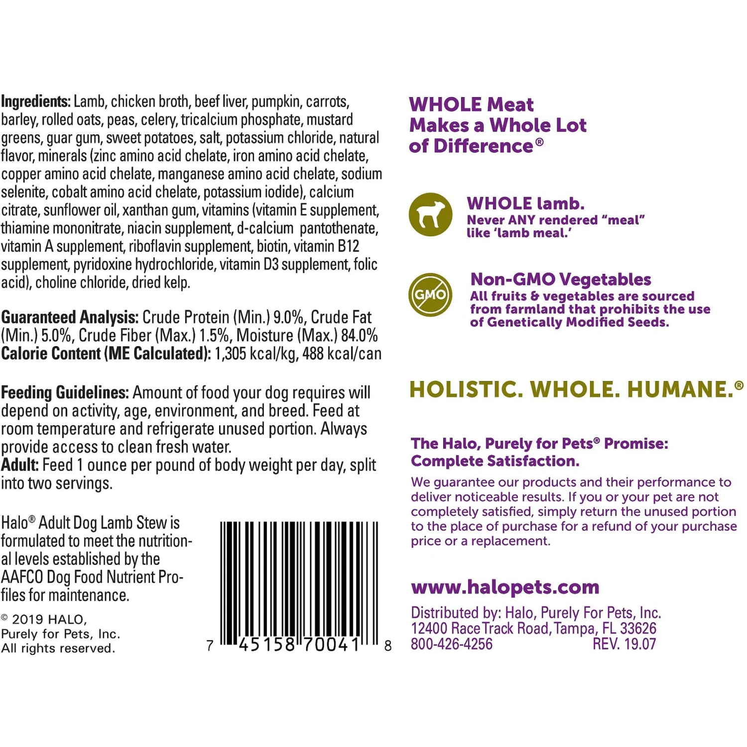 - Halo’s Lamb Stew contains only whole meat—no rendered meat meals.