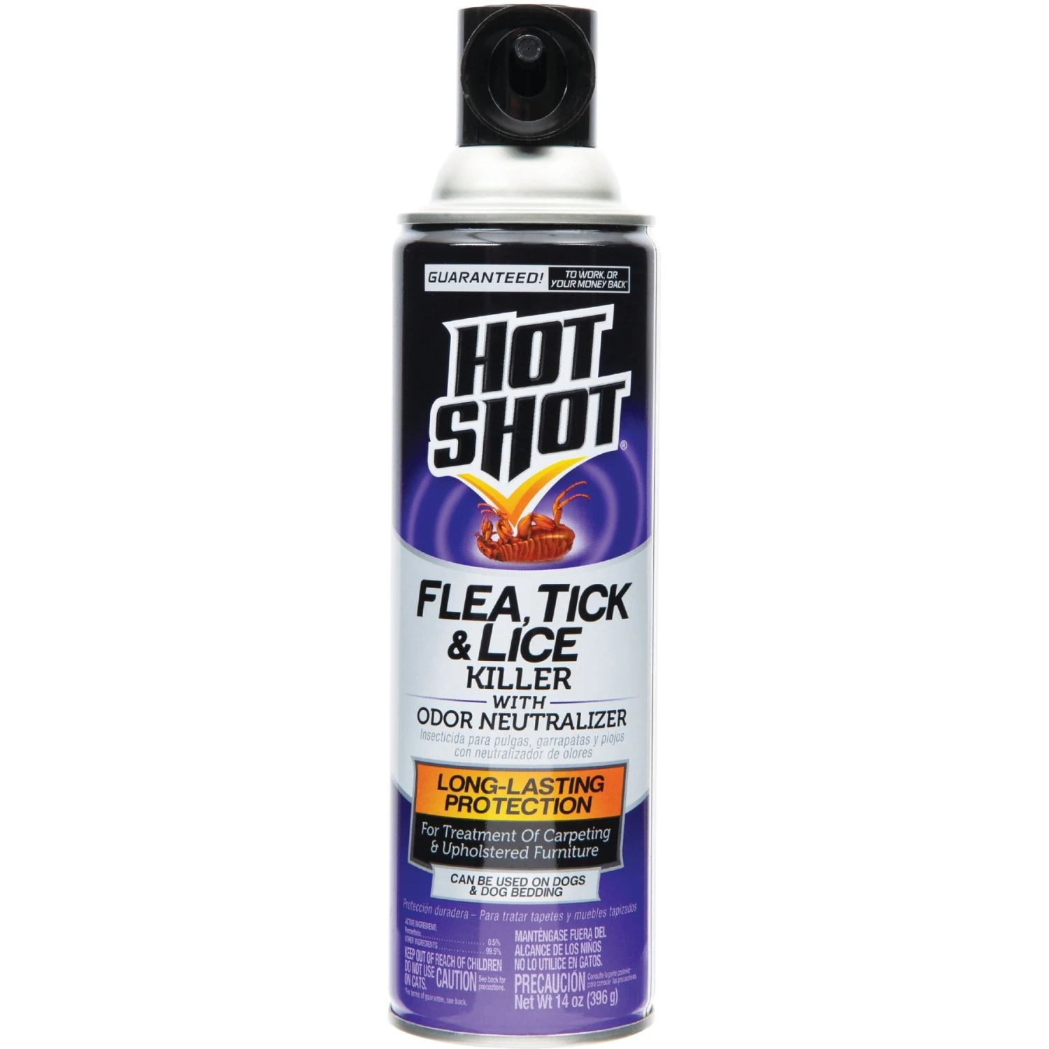 Say farewell to fleas and other unwanted house guests with Hot Shot Flea, Tick & Lice Killer with Odor Neutralizer. This permethrin-based aerosol spray helps rid your carpet, upholstered furniture—and even dog and dog bedding—of fleas, ticks, larvae and lice. Use this long-lasting protection for indoor defense by spraying directly onto infested areas, paying close attention to cracks and crevices where pests could be hiding. For direct use on your dog, begin at the tail while moving the spray dispenser rapidly to make sure the entire body is covered. Be sure to remember to spray the legs and under the body while fluffing the hair so the spray can reach the skin.