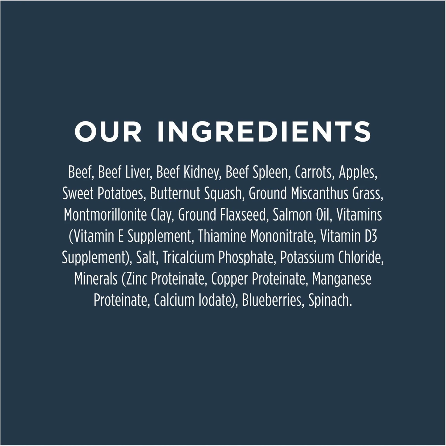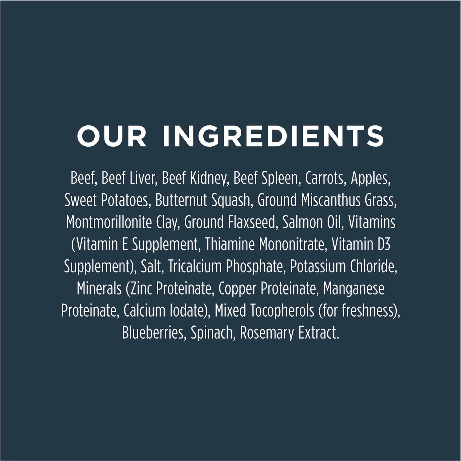 - Protein-packed recipe with natural beef, non-GMO vegetables, fruits and wholesome ingredients, without any grains or fillers mother nature wouldn’t feed her dog.