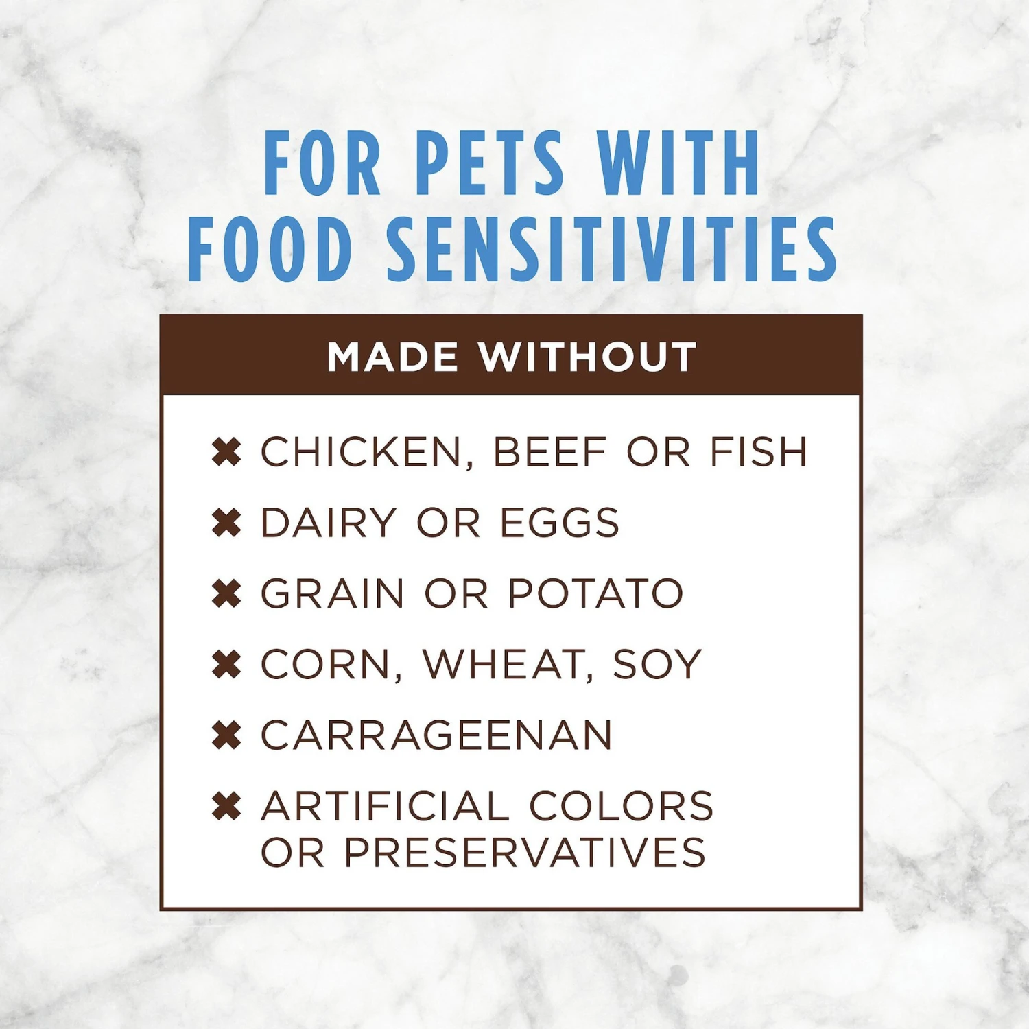 - Made free of chicken, beef, fish, dairy, eggs, grain, potato, corn, wheat or soy.