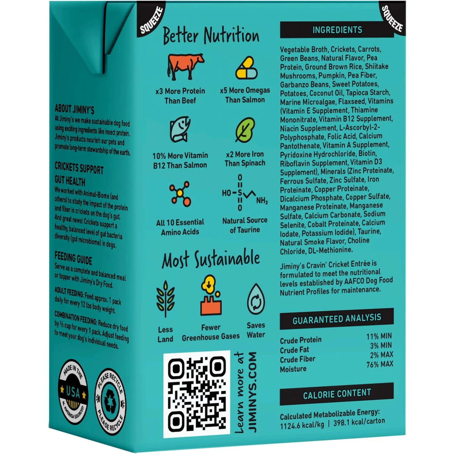 - Jiminy’s insect proteins are carefully sourced and designed to emit fewer greenhouse gases and to reduce the amount of land and water used during production.