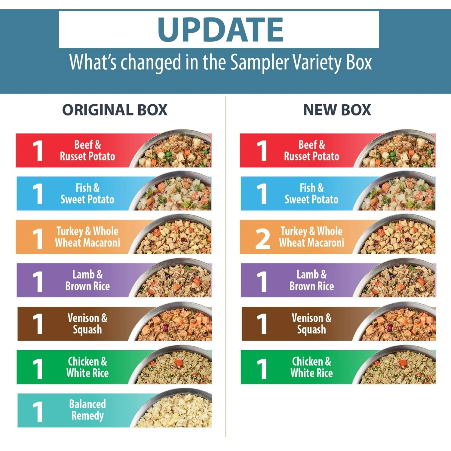 | Flavor | Fish & Sweet Potato, Chicken & White Rice, Lamb & Brown Rice, Beef & Russet Potato, Turkey & Whole Wheat Macaroni, Venison & Squash, Sampler Variety Box |