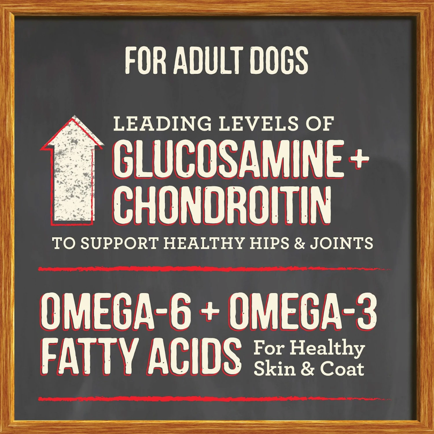 - This premium dog food with ancient grains features glucosamine and chondroitin to provide hip and joint support.