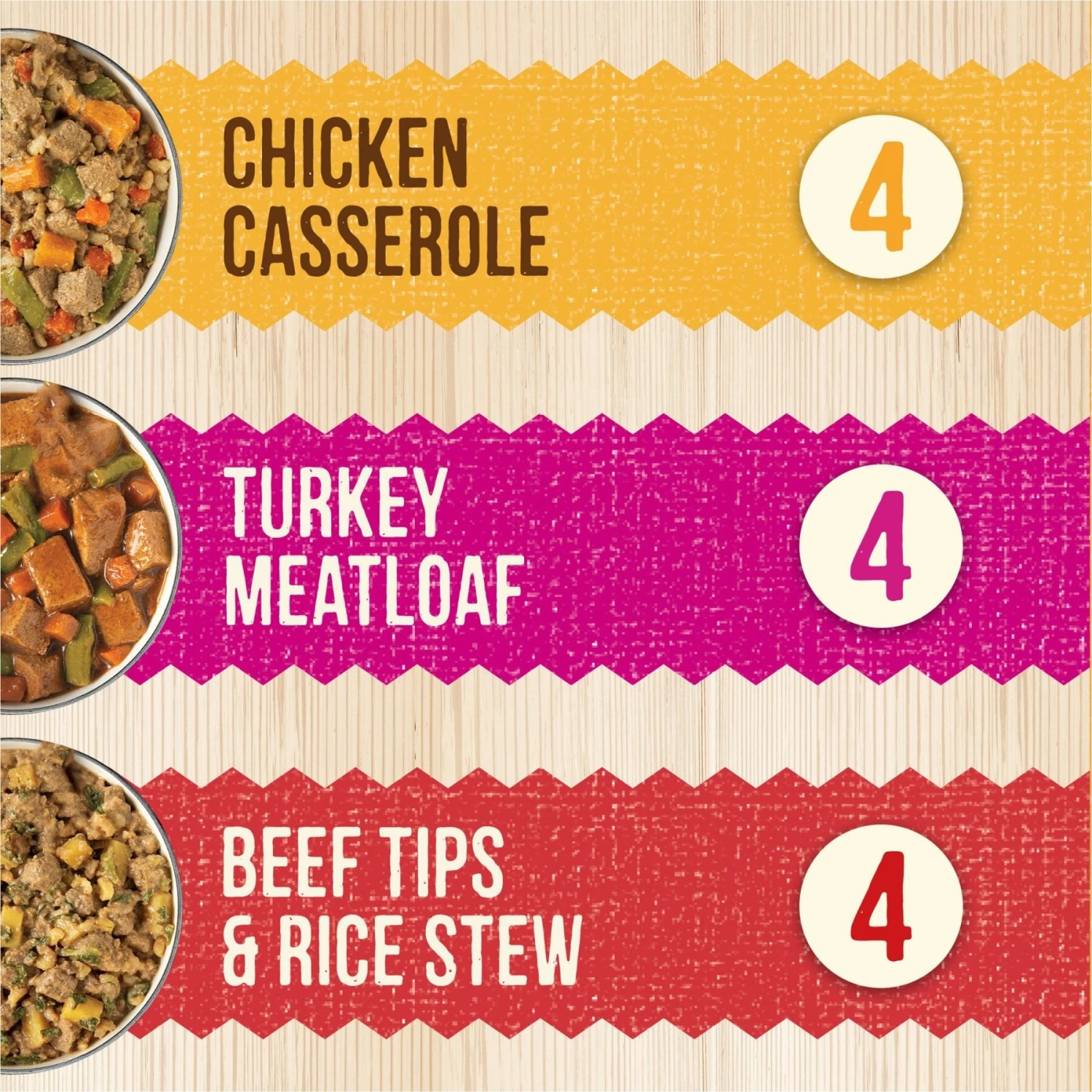 - Variety pack of adult dog food featuring real meat, brown rice and grains in a savory gravy.