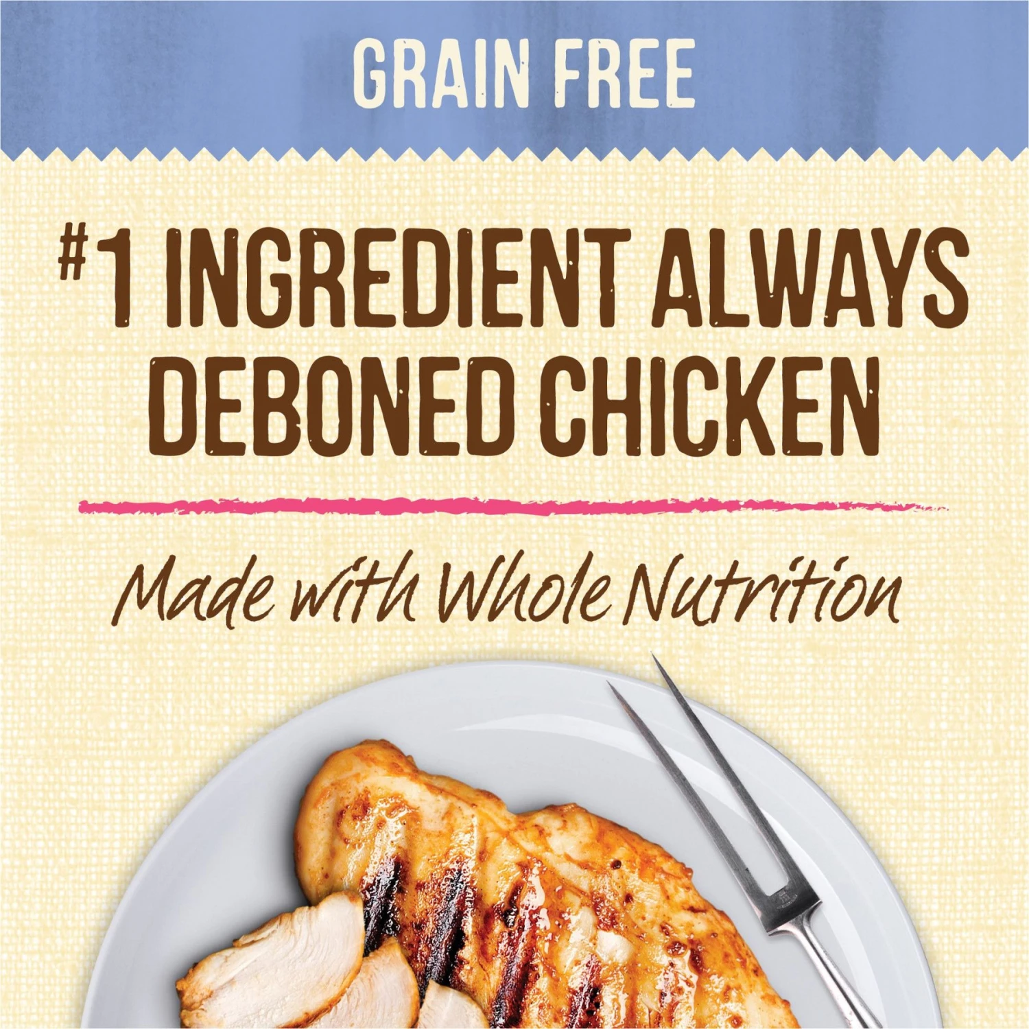 - Real deboned chicken is the first ingredient in this high protein, real meat recipe to help your small sidekick develop lean muscle mass and energy levels.