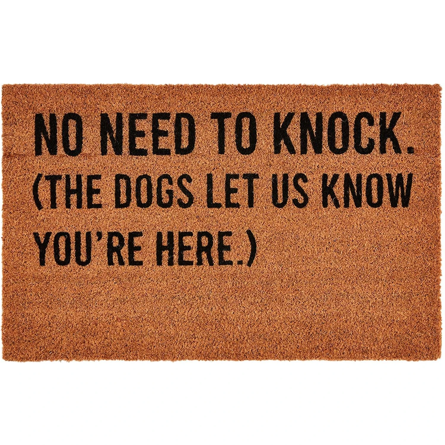 - Mat reads, “No need to knock—the dogs let us know you’re here.”