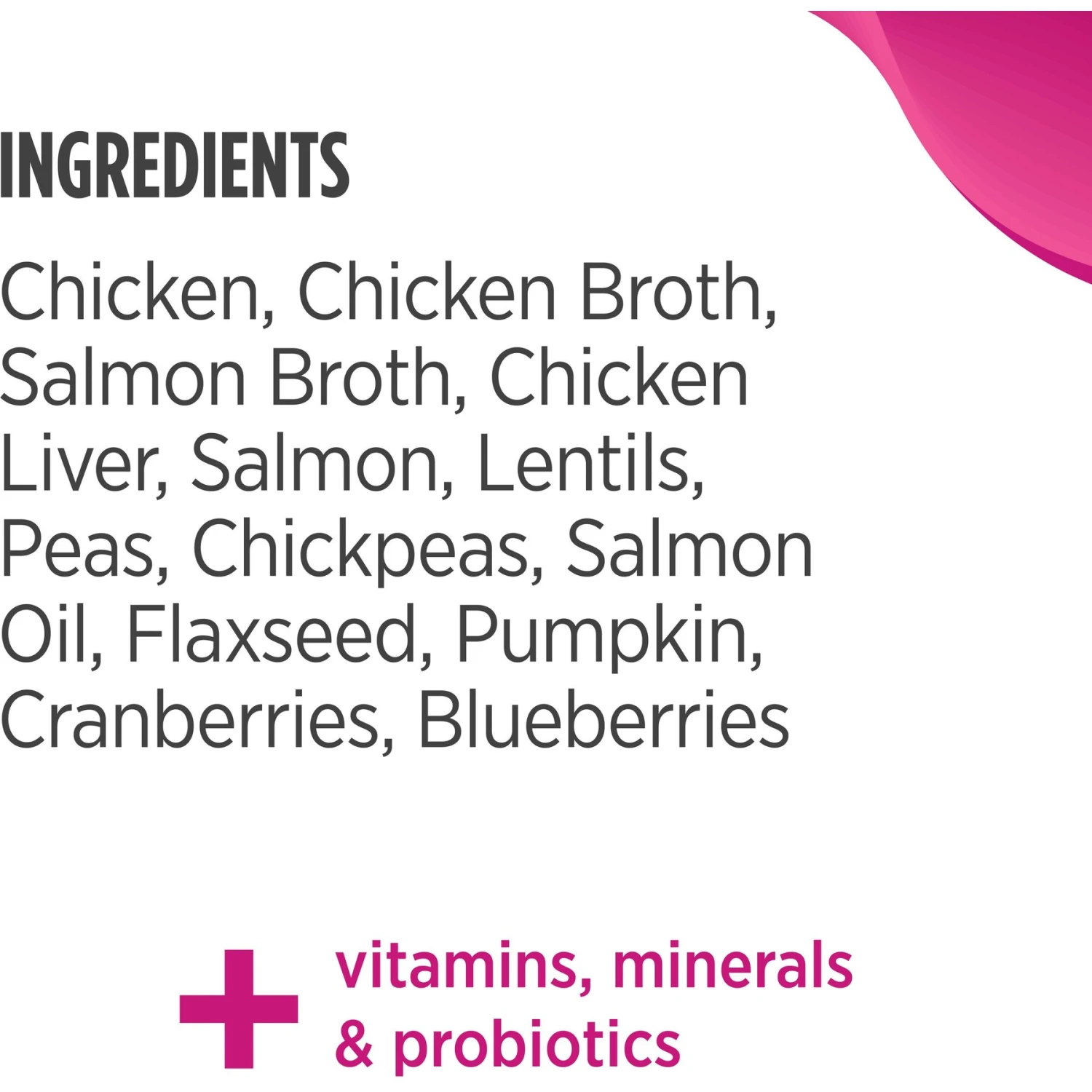 - Made with real chicken, chicken broth, salmon broth, chicken liver, salmon and lentils listed as the top ingredients.