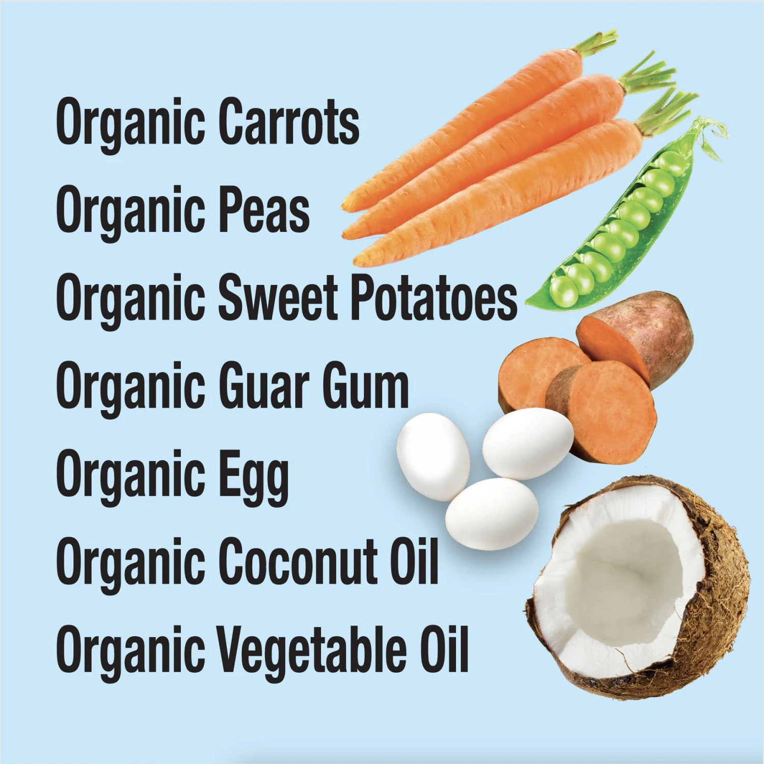 - Organic Carrots, Organic Peas, Organic Sweet Potatoes, Organic Guar Gum, Organic Egg, Organic Coconut Oil, Organic Vegetable Oil enhance this diet.