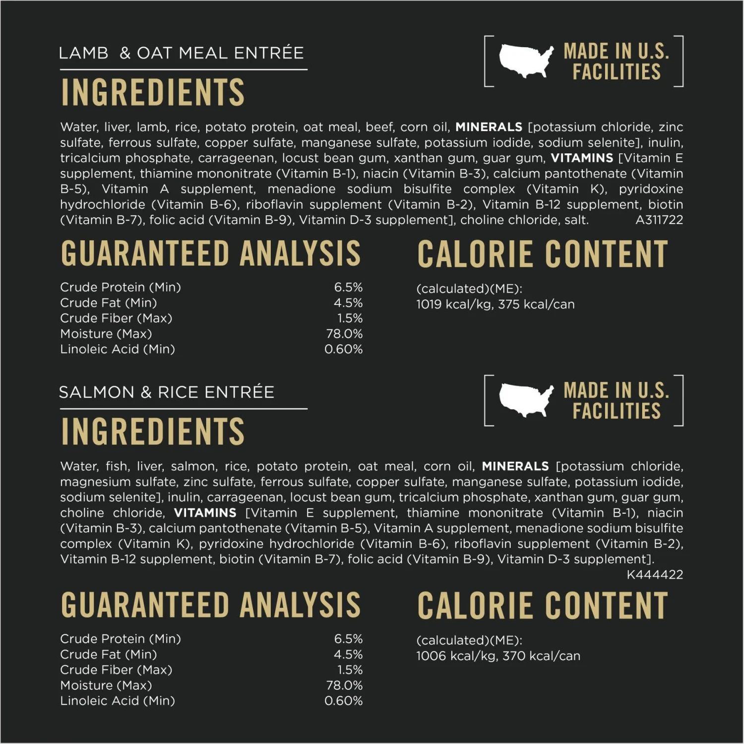 - High protein, wet dog food variety pack features real salmon or lamb and easily digestible rice or oat meal–so it’s gentle on your pup’s stomach and digestive system.