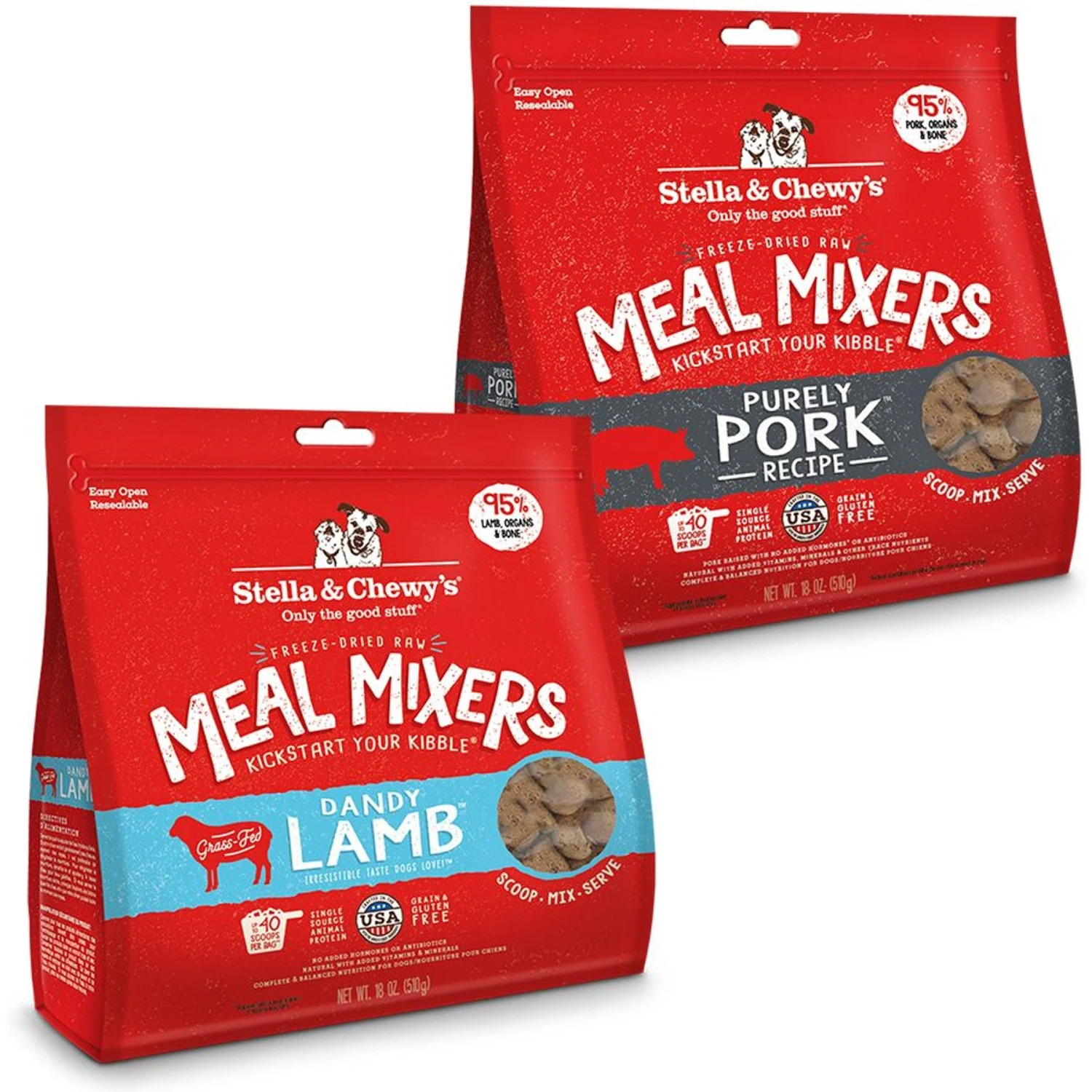 Stella & Chewy’s Dandy Lamb Meal Mixers Freeze-Dried Raw Dog Food Topper & Stella & Chewy’s Meal Mixers Purely Pork Freeze-Dried Raw Dog Food Topper