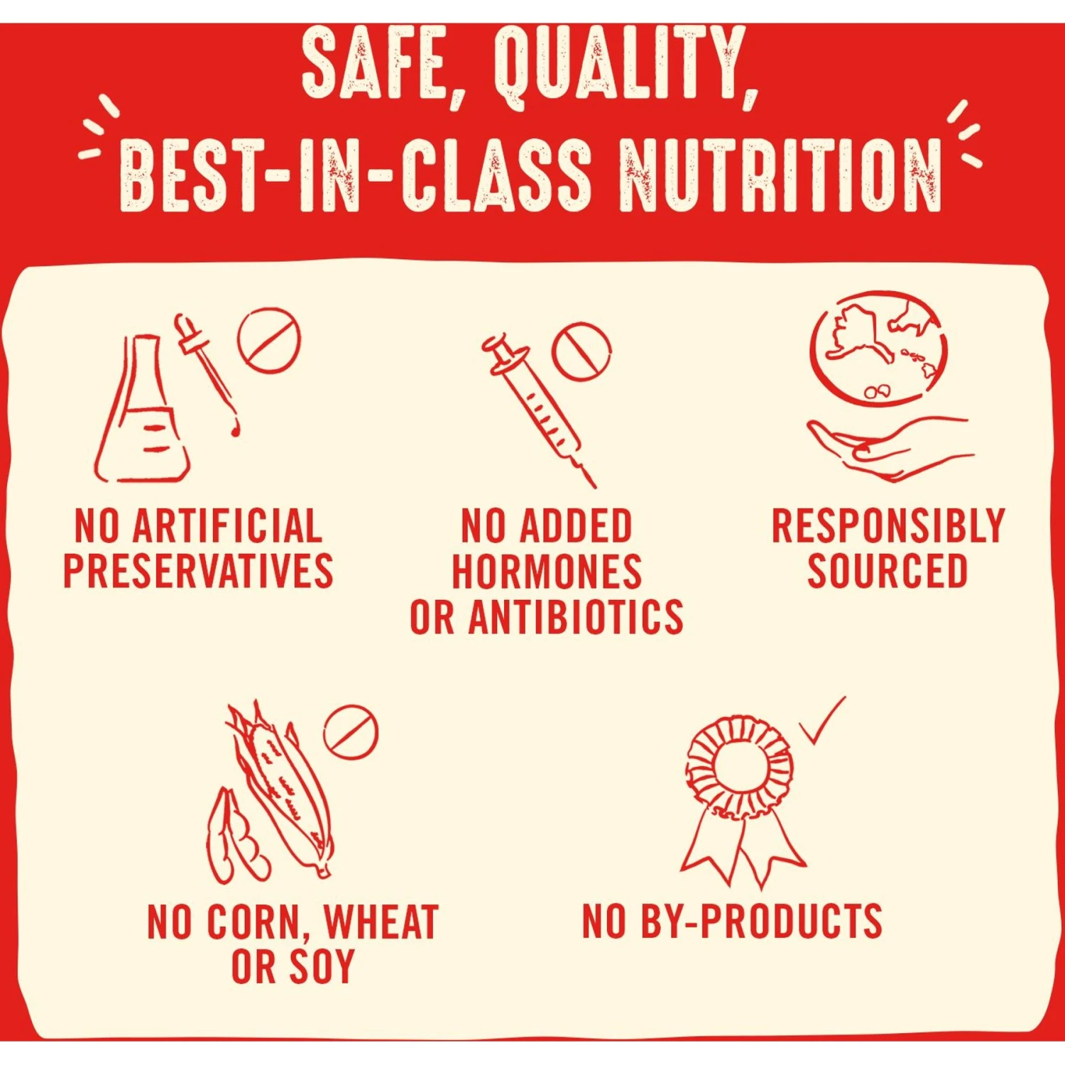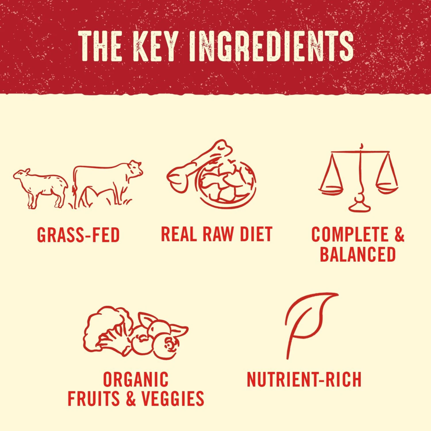 - Made with a blend of grass-fed beef, goat and lamb raised without hormones or antibiotics and 100% organic-certified fruits and vegetables.