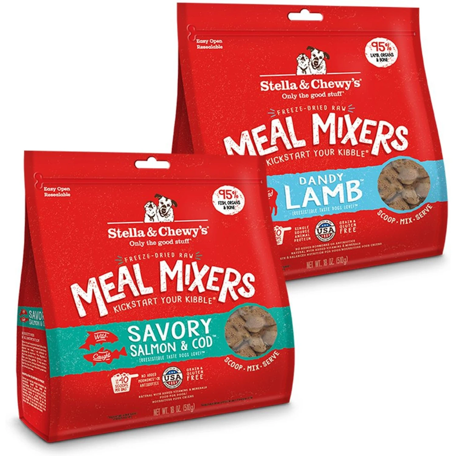 Stella & Chewy’s Savory Salmon & Cod Meal Mixers Freeze-Dried Raw Dog Food Topper & Stella & Chewy’s Dandy Lamb Meal Mixers Freeze-Dried Raw Dog Food Topper