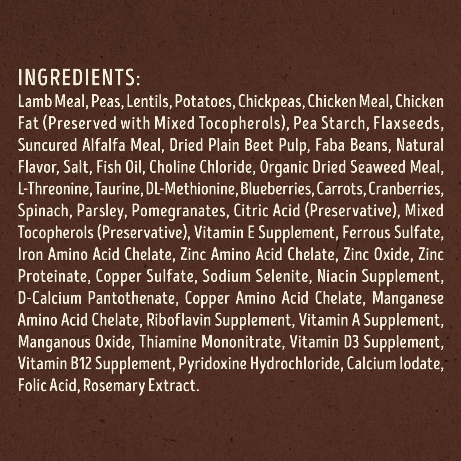 - Lamb meal, which contains even more protein than fresh lamb, is the very first ingredient; also includes real fruits and vegetables including peas, chickpeas, sweet potatoes, berries and more.