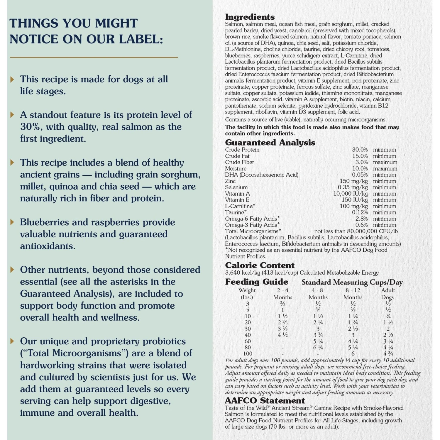 - This smoke-flavored salmon dry dog food with ancient grains is crafted with real fish as the #1 ingredient and is high in protein (30%) to help support bones, joints and lean, strong muscles.