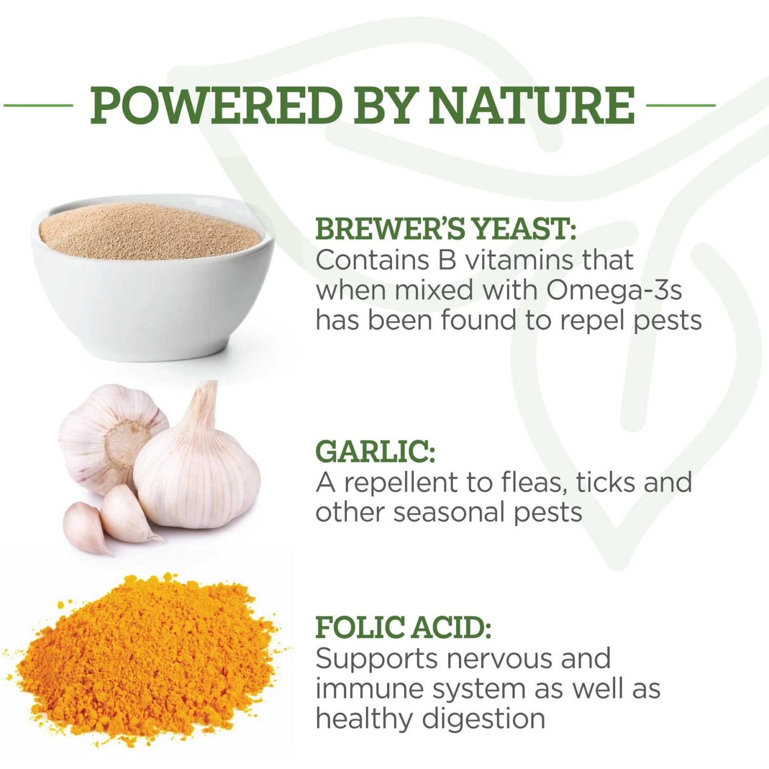 - Designed as a natural defense against fleas, ticks and mosquitoes, this paw-some supplement creates a safe barrier to repel pests before they bite your furry friend.