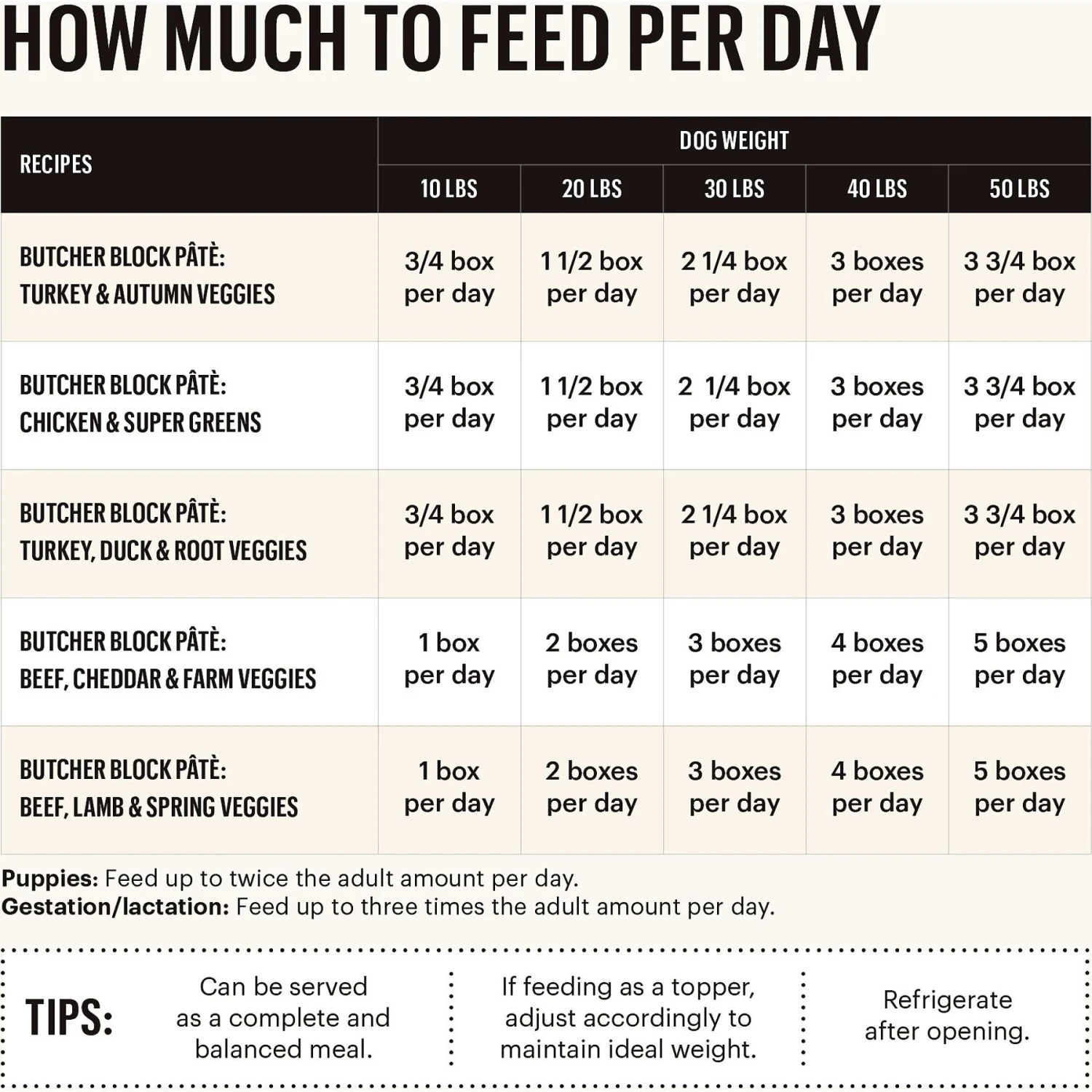 | Flavor | Turkey & Autumn Veggies, Beef, Cheddar & Farm Veggies, Turkey, Duck & Root Veggies, Beef, Lamb & Spring Veggies, Chicken & Super Greens |