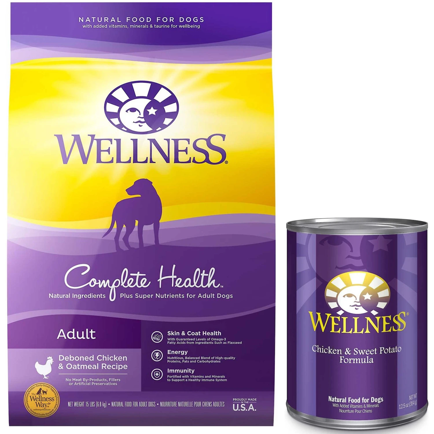 Wellness Complete Health Adult Deboned Chicken & Oatmeal Recipe Dry Dog Food & Wellness Complete Health Chicken & Sweet Potato Formula Natural Canned Dog Food