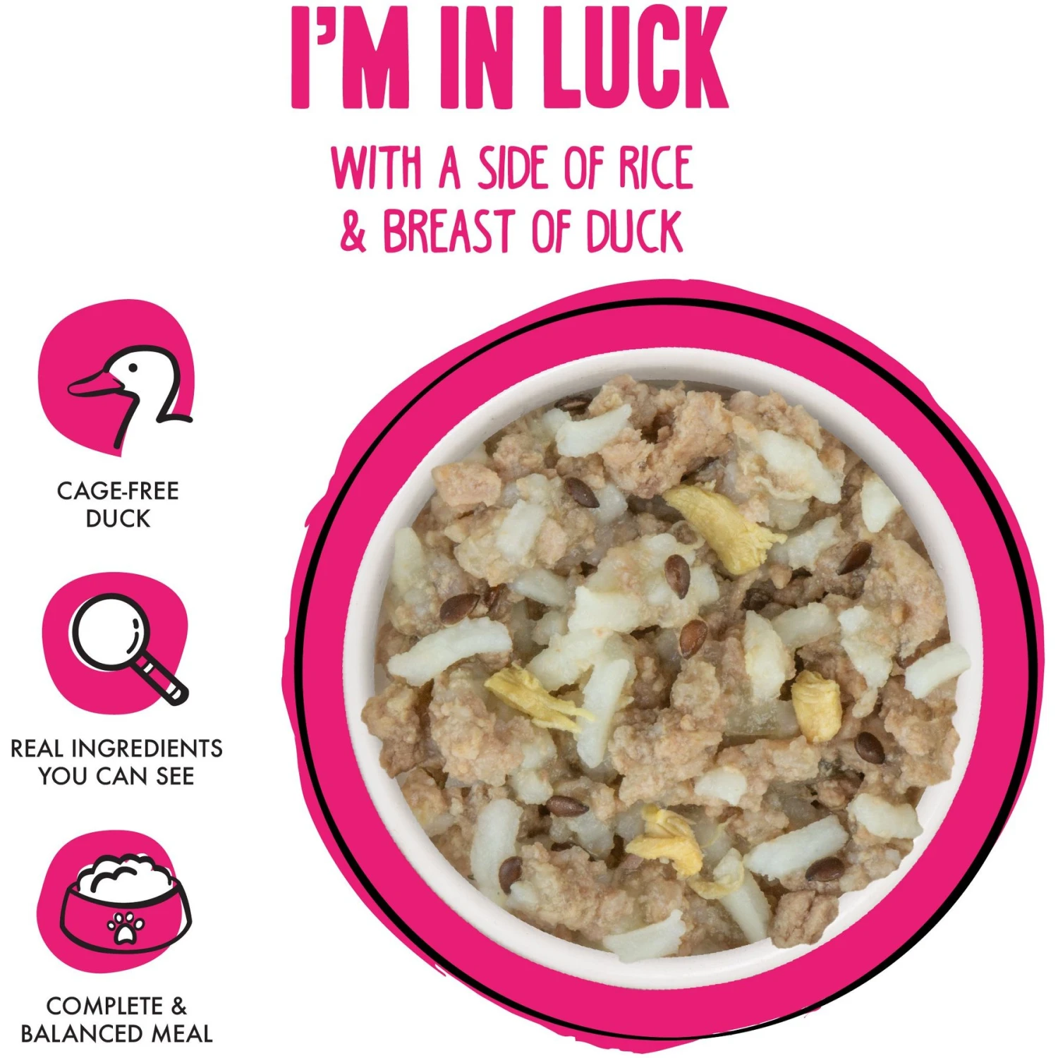 - Complete and balanced meals made with sustainably sourced, cage-free duck and easy-to-digest rice.