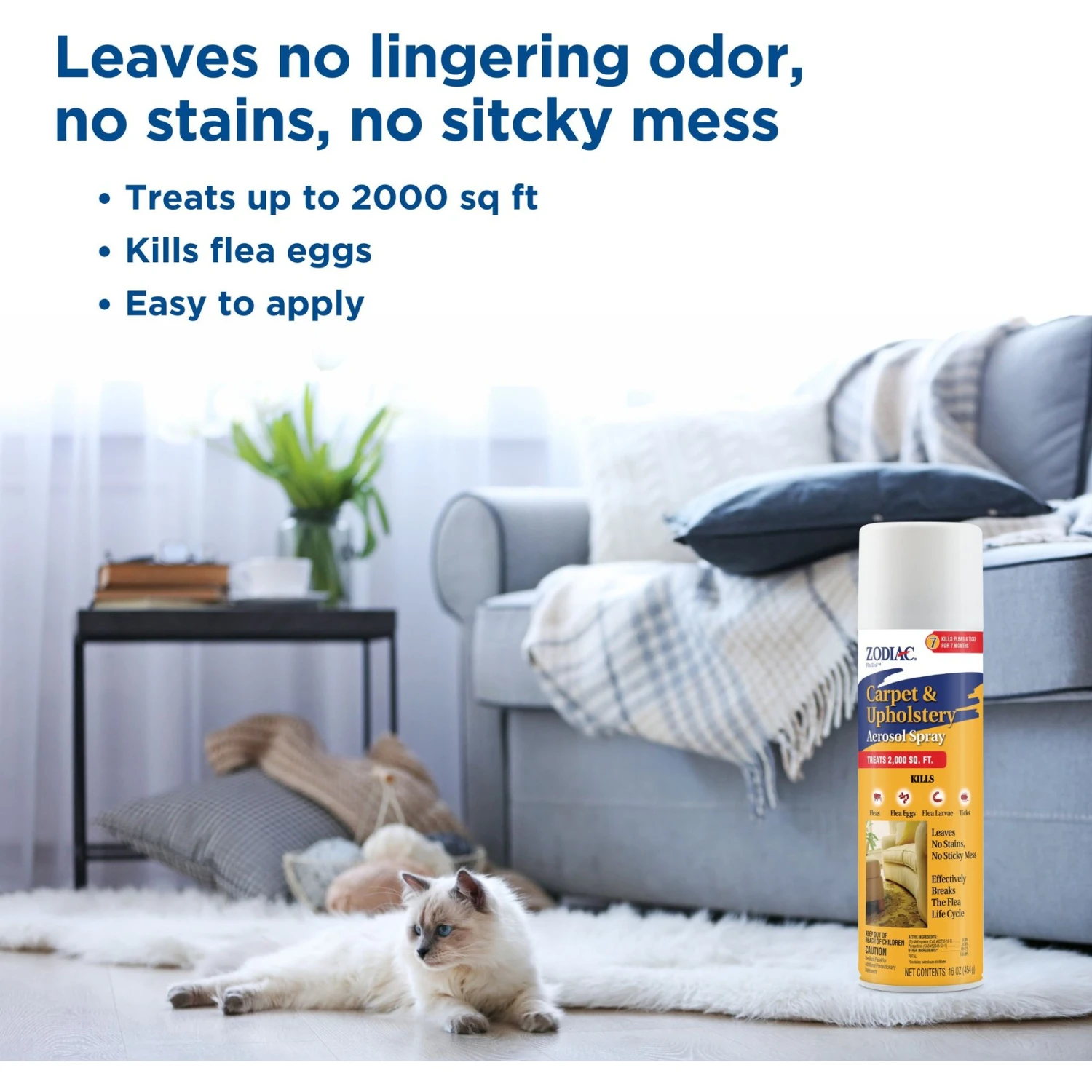Say goodbye to household pests with Zodiac Carpet and Upholstery Aerosol Spray! This convenient spray works to kill fleas, ticks, houseflies, mosquitoes, gnats, lice and other listed insects. Each application offers up to seven months of protection against infestations and flea build up. The convenient spray trigger leaves behind no sticky messes, lingering odors or stains. Zodiac Carpet and Upholstery Aerosol Spray makes a great addition to your regular flea regimen!